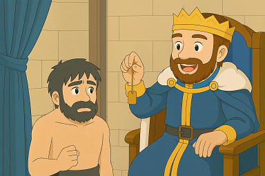 やがて、王さまは、首にかけていたネックレスを出すと、そこにぶらさがっていた木の板を外しました。