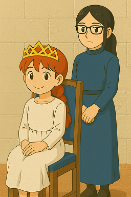 そして、部屋の片隅には、ひめさまが静かに腰掛けていました。その側には、おつきの女官長がいます。