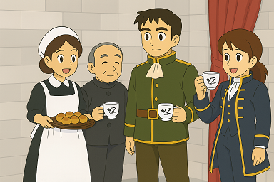 机の上には水差しと茶器が並べられ、席を立つ者、立ち話をする者があちこちに見られます。そこへ、メイドたちがお盆にのせたお茶と小ぶりの焼き菓子を運んできました。