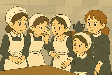 茶器を置き終えた若いメイドが、お盆を抱えて控室に戻ると、先に戻っていた同僚たちが顔を寄せ合っていました。