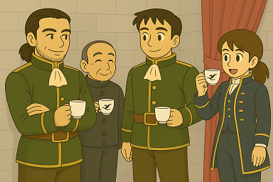 香ばしい茶の香りが立ちこめる中、商人と軍人たちの話はさらに深まっていきます。